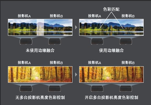 當(dāng)多臺投影機同時投影時,色彩匹配功能能夠修正各臺投影機投射出來的細微色彩差異。當(dāng)多臺投影機同時投影時,色彩匹配功能能夠修正各臺投影機投射出來的細微色彩差異。輔助調(diào)整軟件使調(diào)整結(jié)果更加精準(zhǔn),過程更簡單。