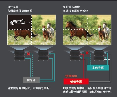 當(dāng)主信號源出現(xiàn)故障時*4,備份輸入設(shè)置確保投影機可立即自動切換至輔信號源,該功能確保了投影機的高可靠性,適用于核心部門的監(jiān)控室、實物投影、舞臺演出及其他不能中斷圖像顯示的場所。