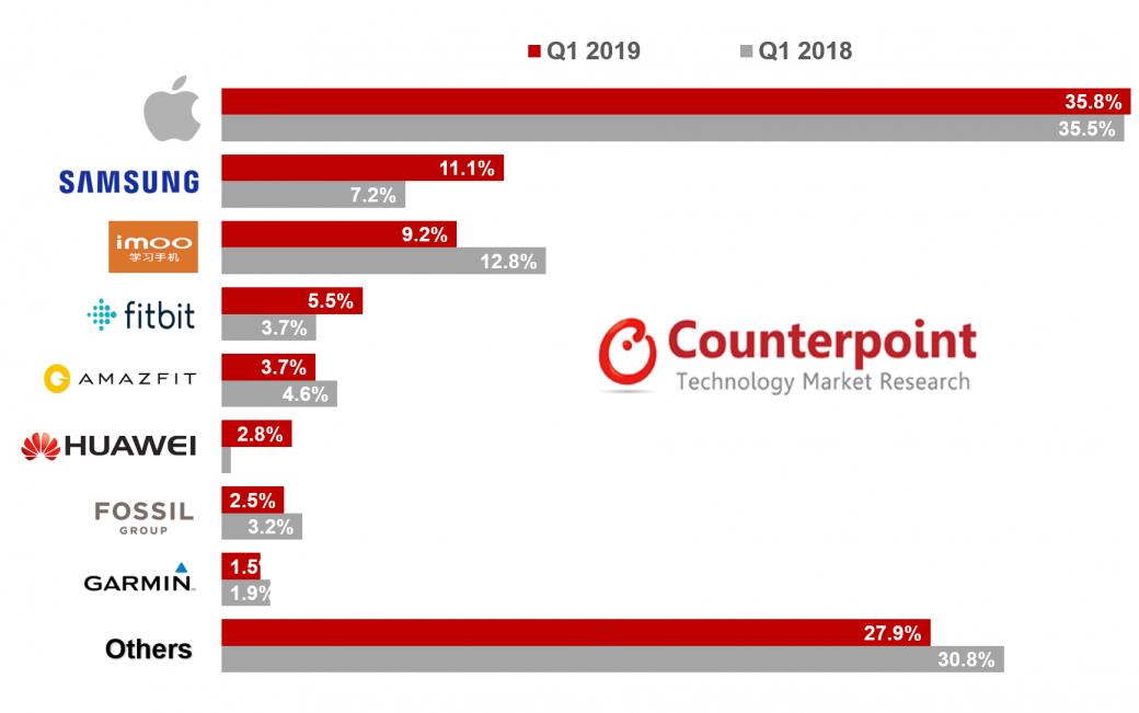 Counterpoint 這份最新的全球智能手表追蹤報告稱,受蘋果、三星、Fitbit 和華為幾大品牌智能手表出貨量的推動,2019 年第一季度全球智能手表出貨量增長呈現出健康的狀態(tài),同比增長達到了 48%。