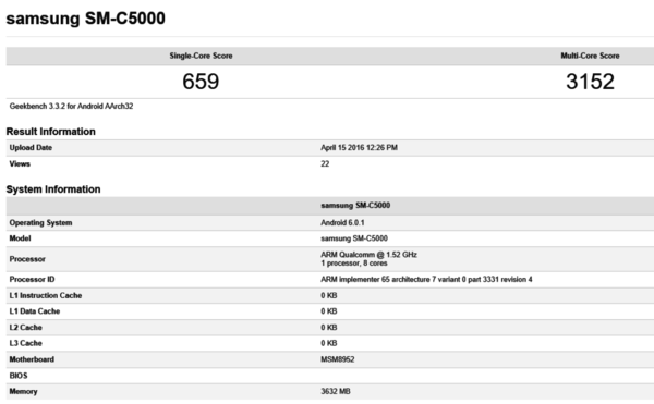 配置方面,三星Galaxy C5的型號(hào)為SM-C5000,單線程跑分659,多線程跑分3152,搭載主頻為1.52GHz的八核心(A53架構(gòu))處理器,運(yùn)存為4GB,運(yùn)行Android 6.0.1操作系統(tǒng)。