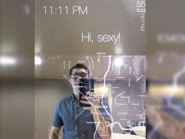 微軟的這面智能鏡子名為Magic Mirror,是一面單面鏡。鏡子的下面帶有一個23.6英寸的LCD顯示屏,可以在黑色的鏡子上顯示白色的信息。這面鏡子可以運用Windows Hello生物識別功能,通過面部識別來探索用戶的心情。