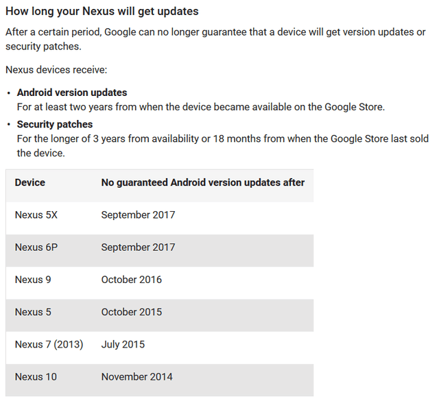 當(dāng)然停止接收系統(tǒng)更新并不等于停止接收安全補丁。根據(jù)該表格文字所述,Nexus設(shè)備在上架3年內(nèi)、或Google Store停售后18個月內(nèi)都將持續(xù)獲得安全補丁更新。舉例來說,Nexus 9于今年4月停售,因此直至18個月后——也就是2017年10月——Nexus 9都將能夠獲得安全補丁的更新。